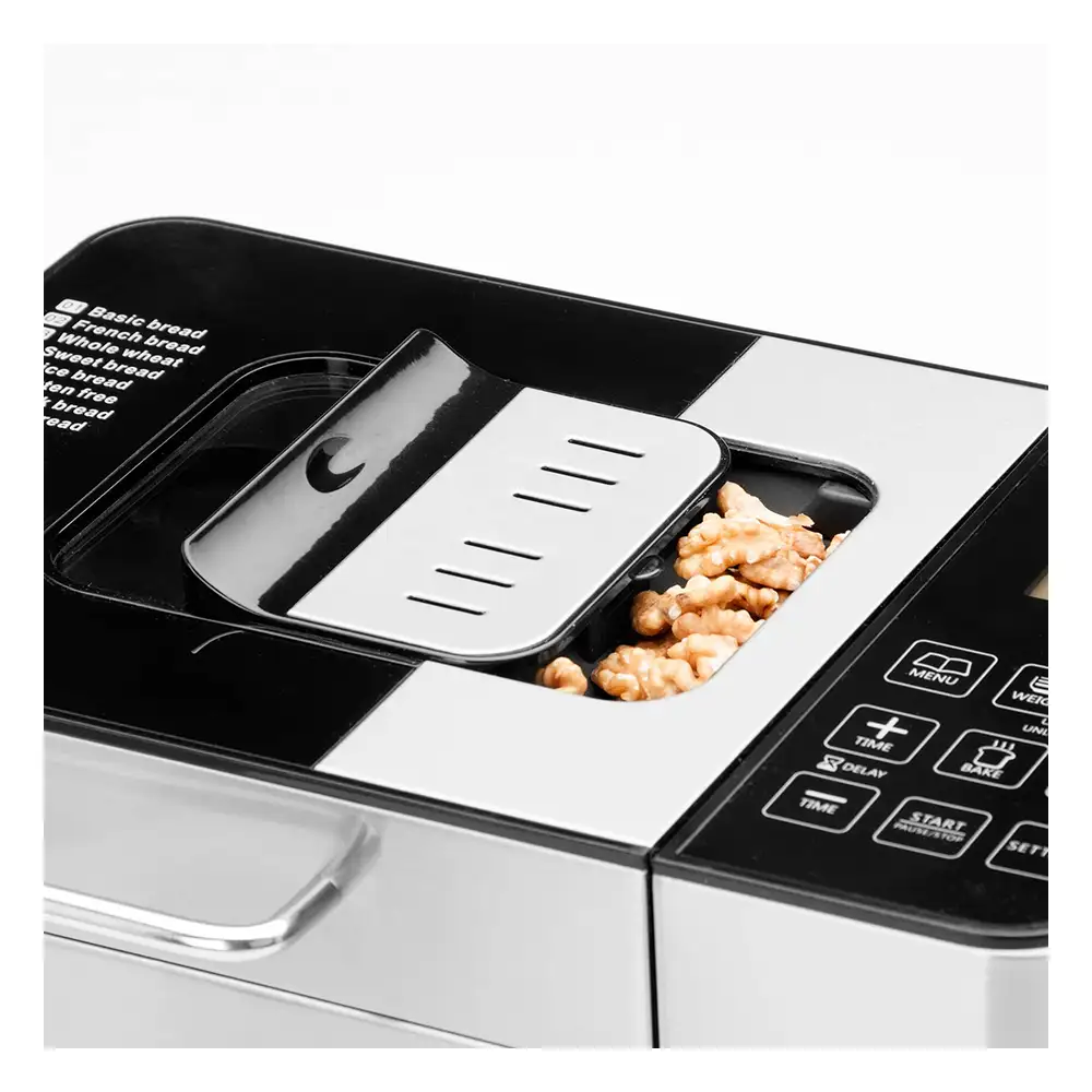 De Gastroback 42823 Design Advance broodbakmachine is van alle markten thuis. Met zijn 18 programma’s maakt u eenvoudig brood, jam, yoghurt, gebak en zelfs ijs*. Met het speciale ingrediëntencompartiment voegt u automatisch, op het juiste moment noten, zaden, pitten, fruit of chocoladechips toe. Onder de programma’s vind u een programma voor volkorenbrood, witbrood, of stokbrood, zoet brood en fruit brood, voor bijvoorbeeld pasta, pizza of koekjesdeeg, een jam-programma voor jam, marmelade en gelei, een programma voor romige zelfgemaakte yoghurt, een speciaal glutenvrij- en rijstbroodprogramma en een ontdooiprogramma. Daarnaast zit er ook nog de mogelijkheid op een programma naar eigen inzicht te programmeren. Met de timer kunt u tot 15 uur van te voren het bakproces instellen , waarna het middels de warmhoud functie tot 60 minuten heerlijk warm gehouden wordt, zo heeft u altijd vers gebakken brood. Het bakblik is voorzien van een FUSION-Sol gel coating (PFTE en PFOA-vrij).