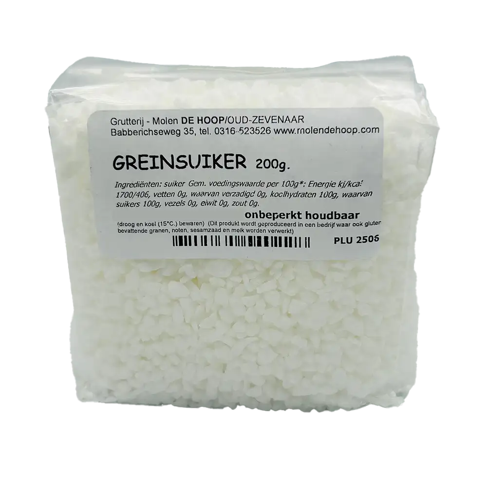 Greinsuiker is suiker in een grovere substantie en wordt gebruikt voor het decoreren van diverse gerechten. Denk bijvoorbeeld aan suikerbrood, Janhagel koekjes, kerstkransjes, kanaalbollen enz.