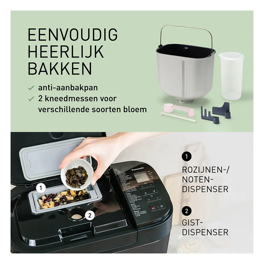 Met de Panasonic SD-YR2540HXD broodbakmachine wordt het thuisbakken van heerlijk, ambachtelijk en vers brood wel heel eenvoudig. Gebruik een broodmix (van bv Molen de Hoop) naar keuze, voeg water en gist toe en voilà! Geniet van de heerlijke geur van vers gebakken brood.