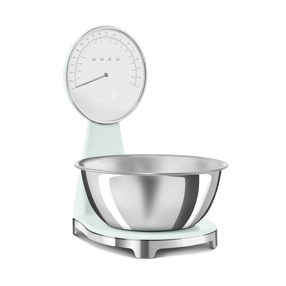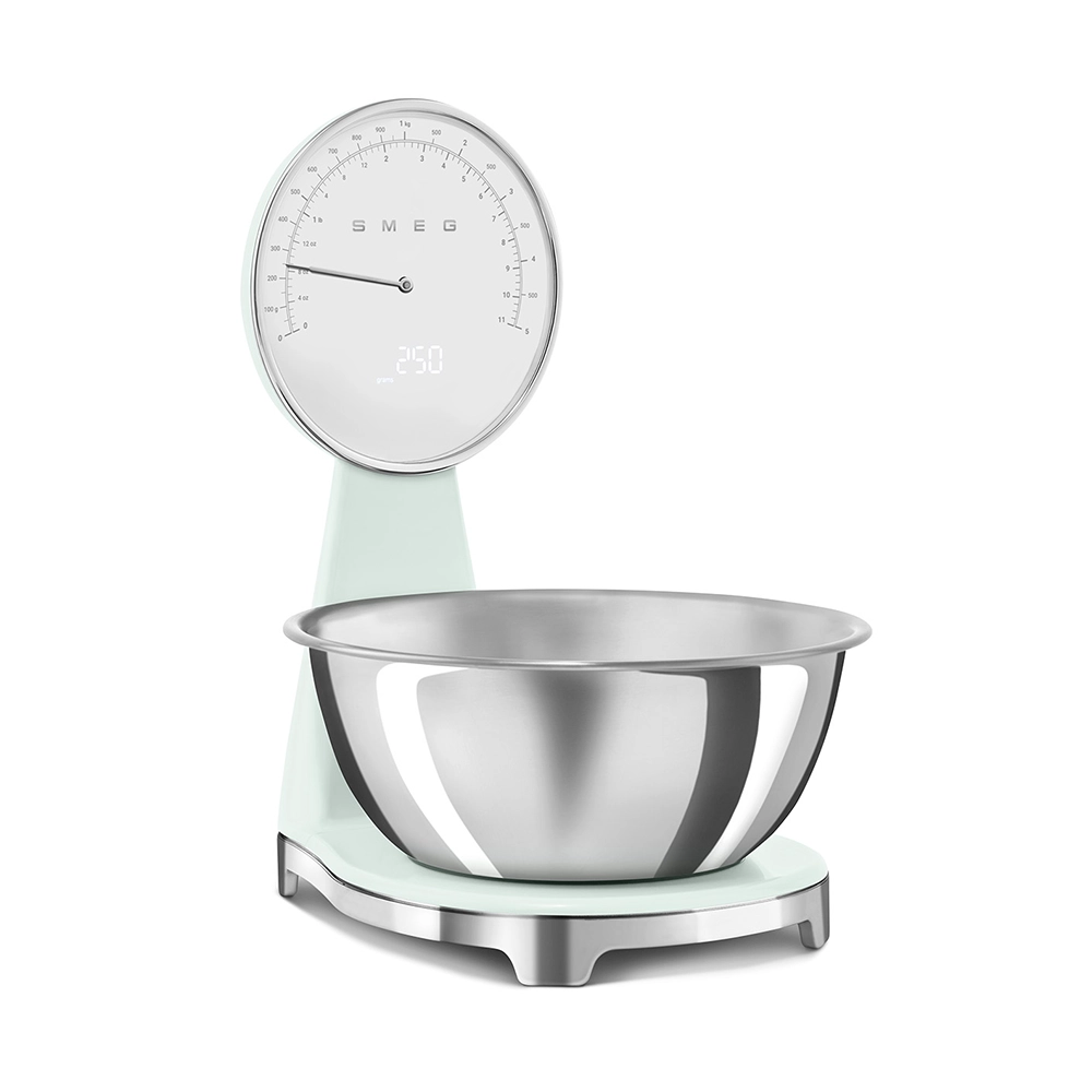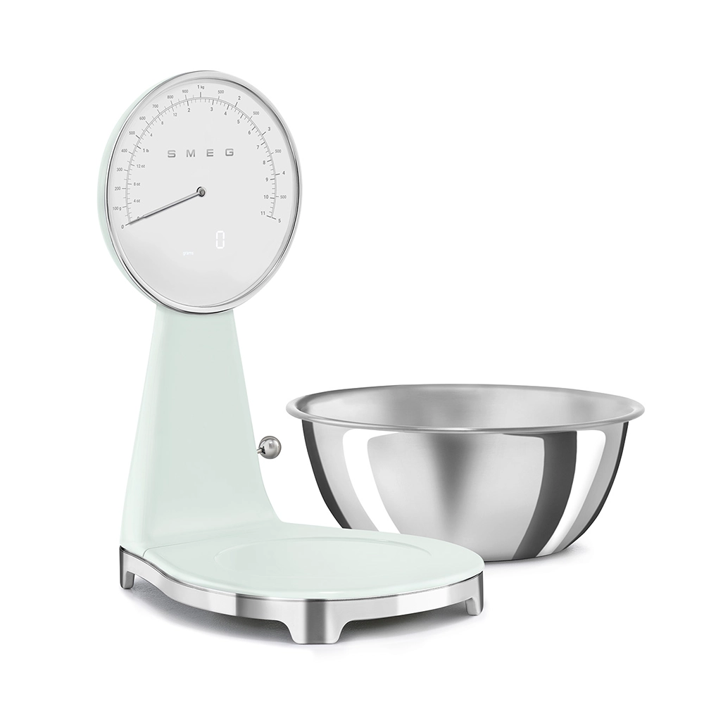 De analoge en digitale Smeg keukenweegschaal in stijlvolle watergroene kleur combineert het iconische jaren 50 design met moderne functionaliteit. Perfect voor iedereen die nauwkeurig wil afwegen zonder concessies te doen aan uitstraling en gebruiksgemak. Deze design keukenweegschaal is een praktische én stijlvolle toevoeging aan iedere keuken.