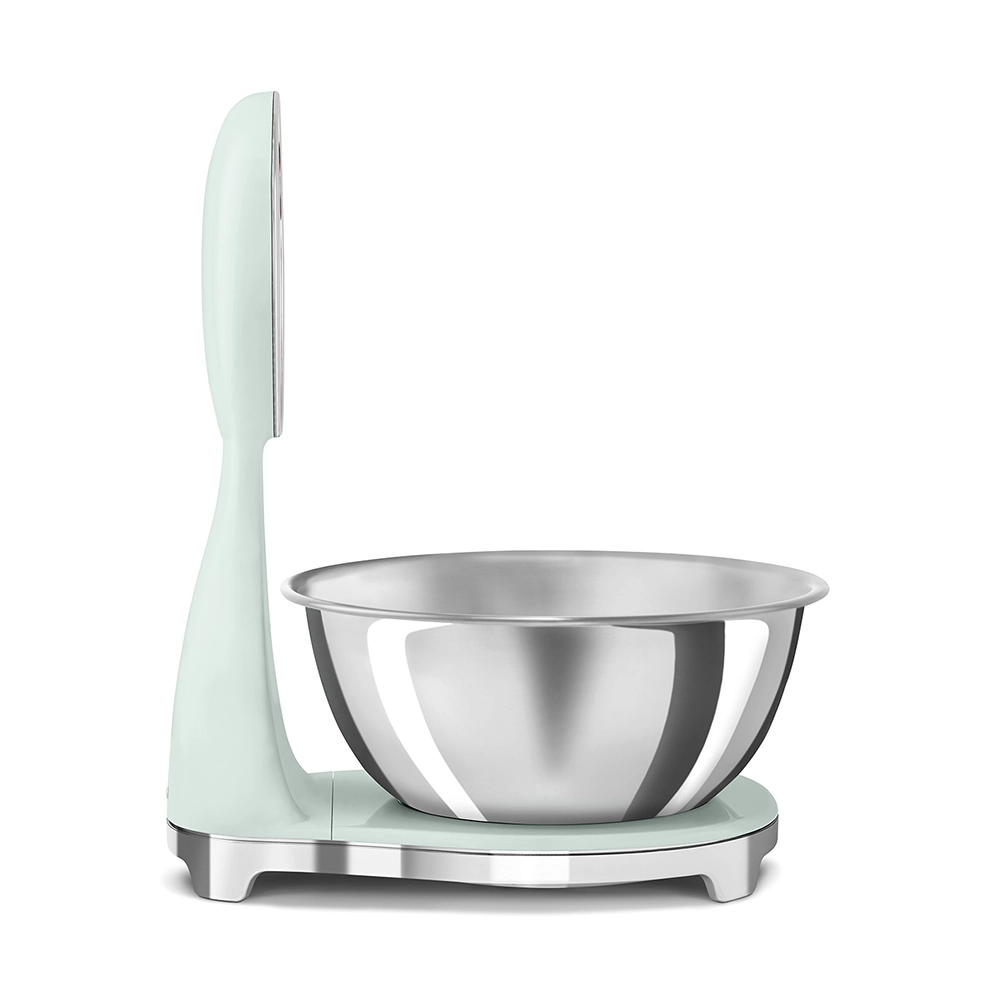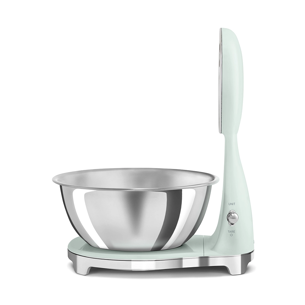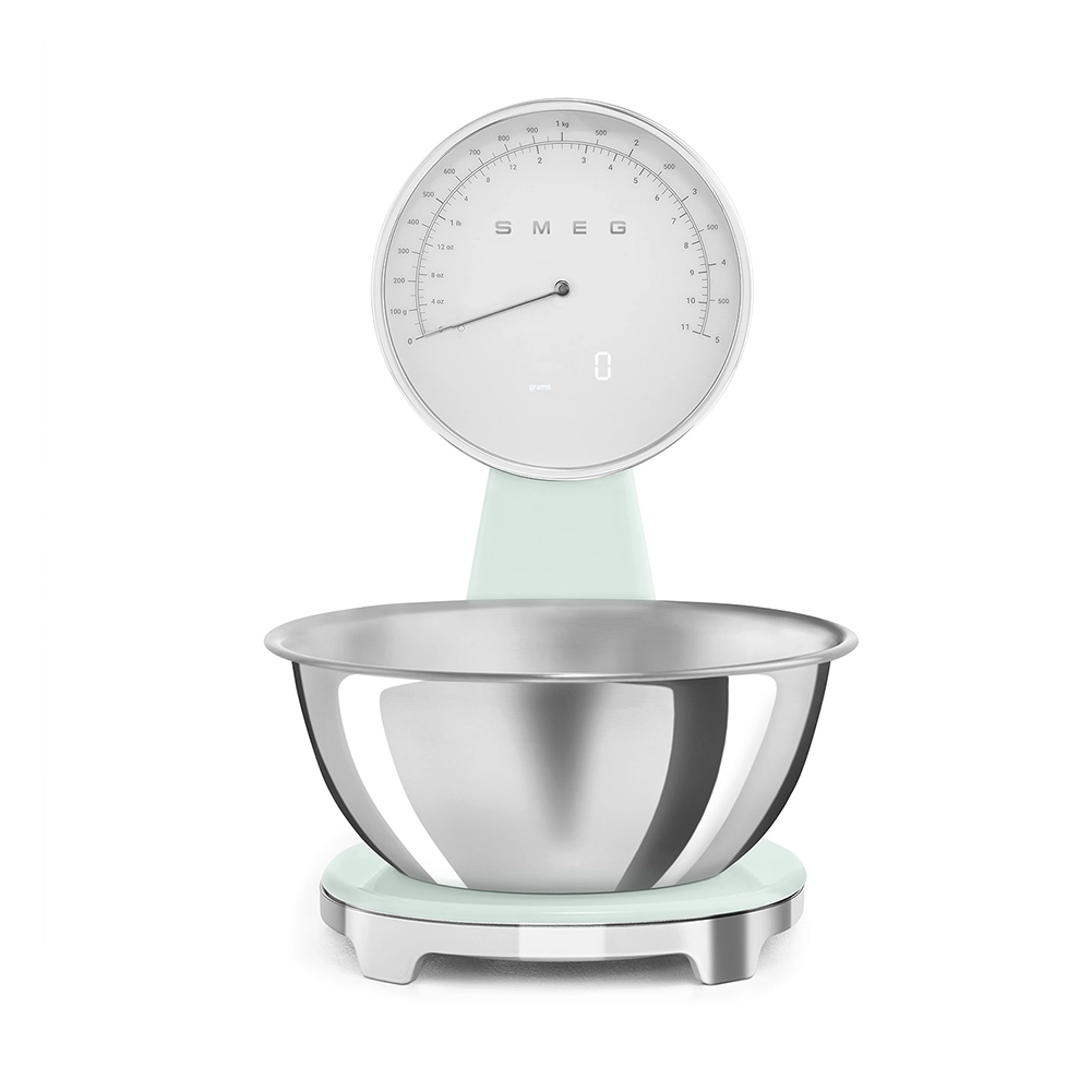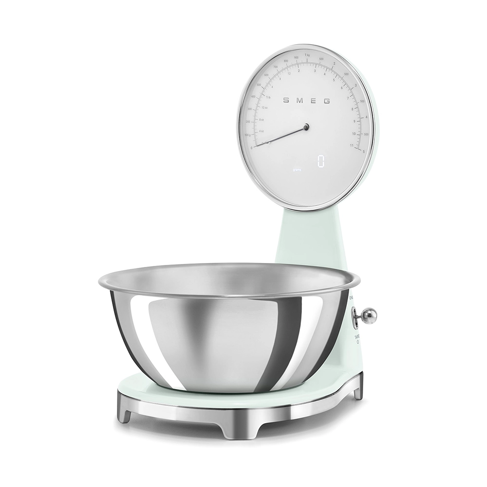 De analoge en digitale Smeg keukenweegschaal in stijlvolle watergroene kleur combineert het iconische jaren 50 design met moderne functionaliteit. Perfect voor iedereen die nauwkeurig wil afwegen zonder concessies te doen aan uitstraling en gebruiksgemak. Deze design keukenweegschaal is een praktische én stijlvolle toevoeging aan iedere keuken.