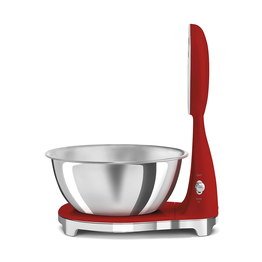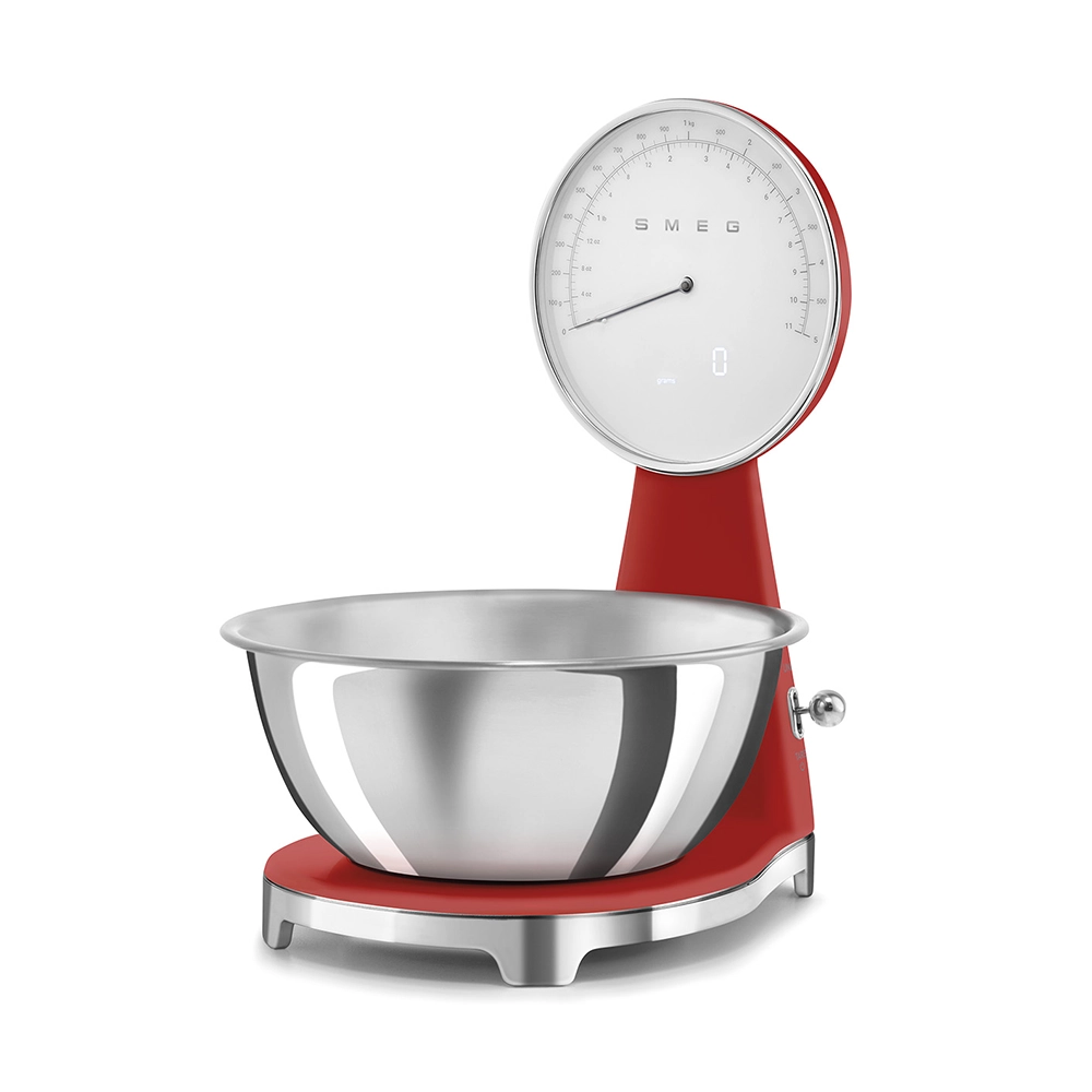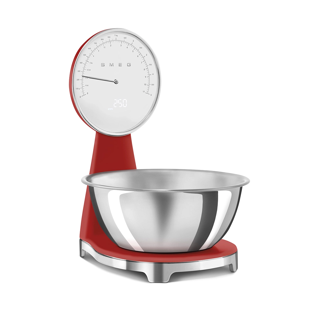 De analoge en digitale Smeg keukenweegschaal in stijlvolle rode kleur combineert het iconische jaren 50 design met moderne functionaliteit. Perfect voor iedereen die nauwkeurig wil afwegen zonder concessies te doen aan uitstraling en gebruiksgemak. Deze design keukenweegschaal is een praktische én stijlvolle toevoeging aan iedere keuken.