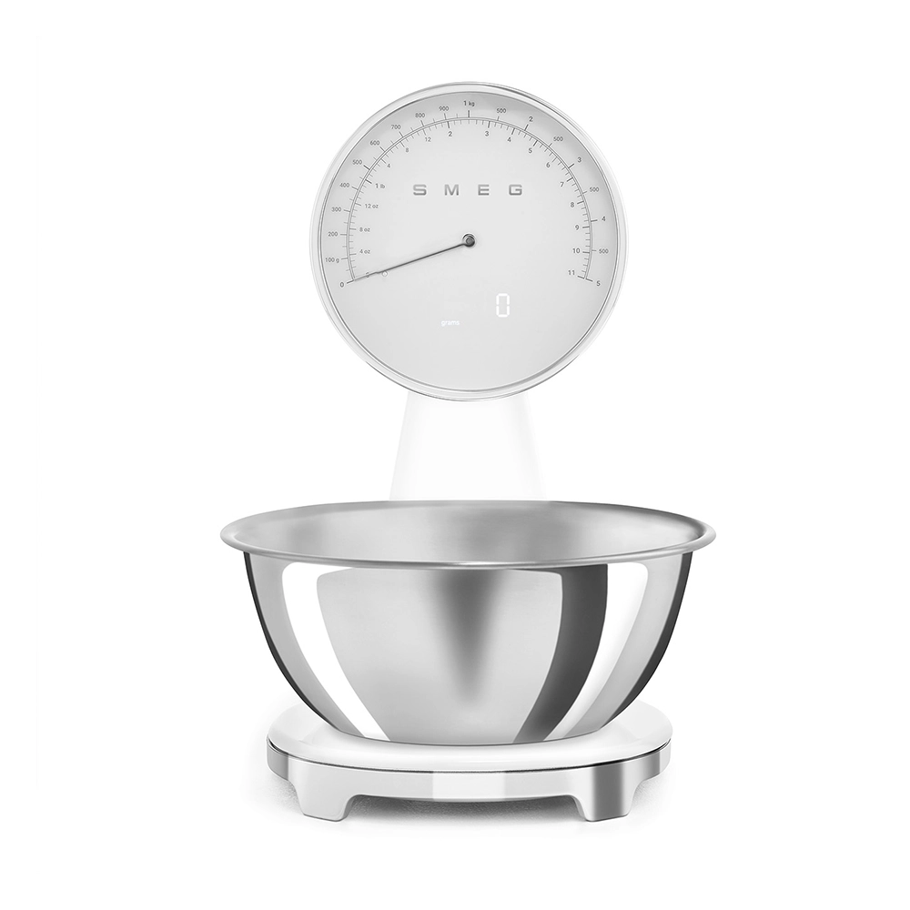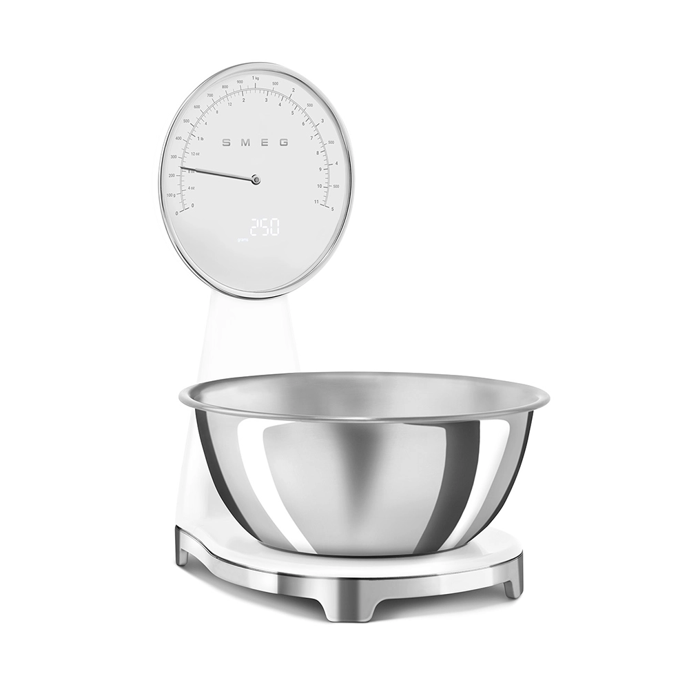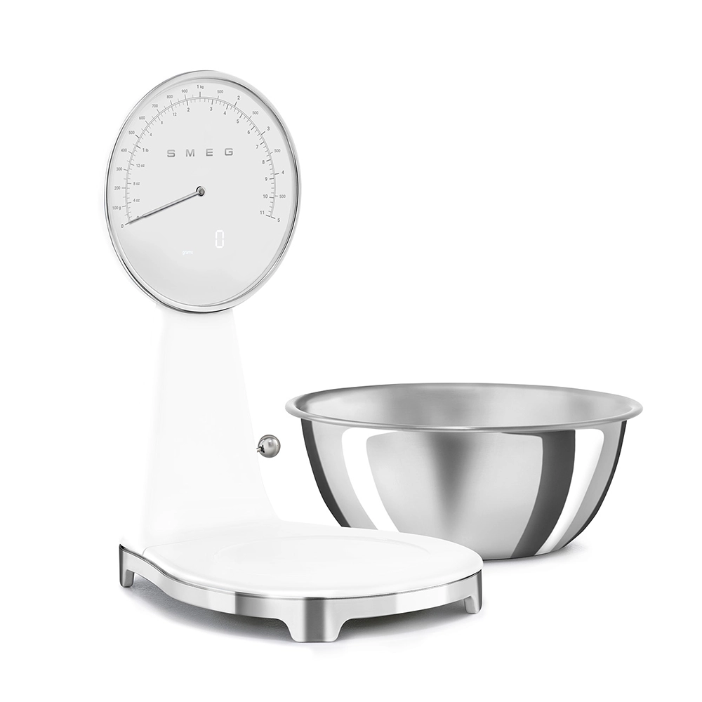 De analoge en digitale Smeg keukenweegschaal in stijlvolle witte kleur combineert het iconische jaren 50 design met moderne functionaliteit. Perfect voor iedereen die nauwkeurig wil afwegen zonder concessies te doen aan uitstraling en gebruiksgemak. Deze design keukenweegschaal is een praktische én stijlvolle toevoeging aan iedere keuken.