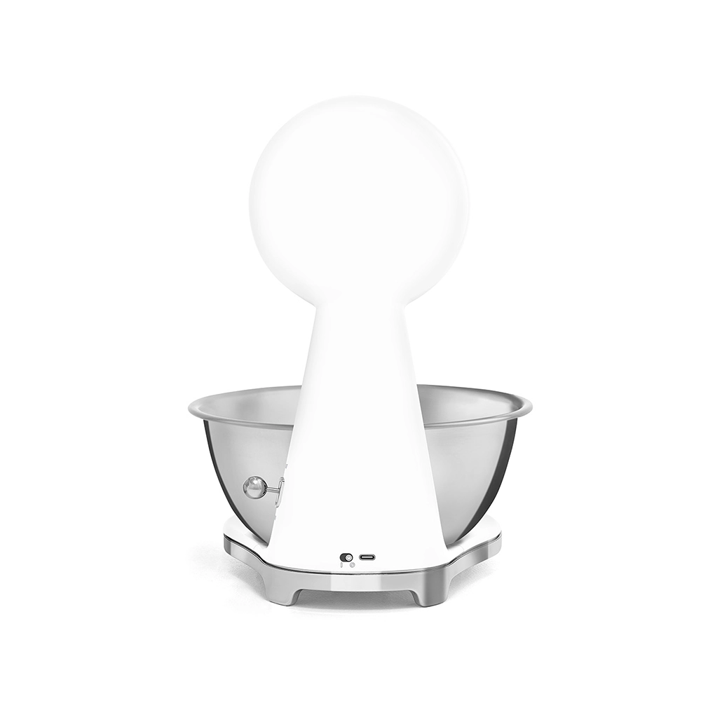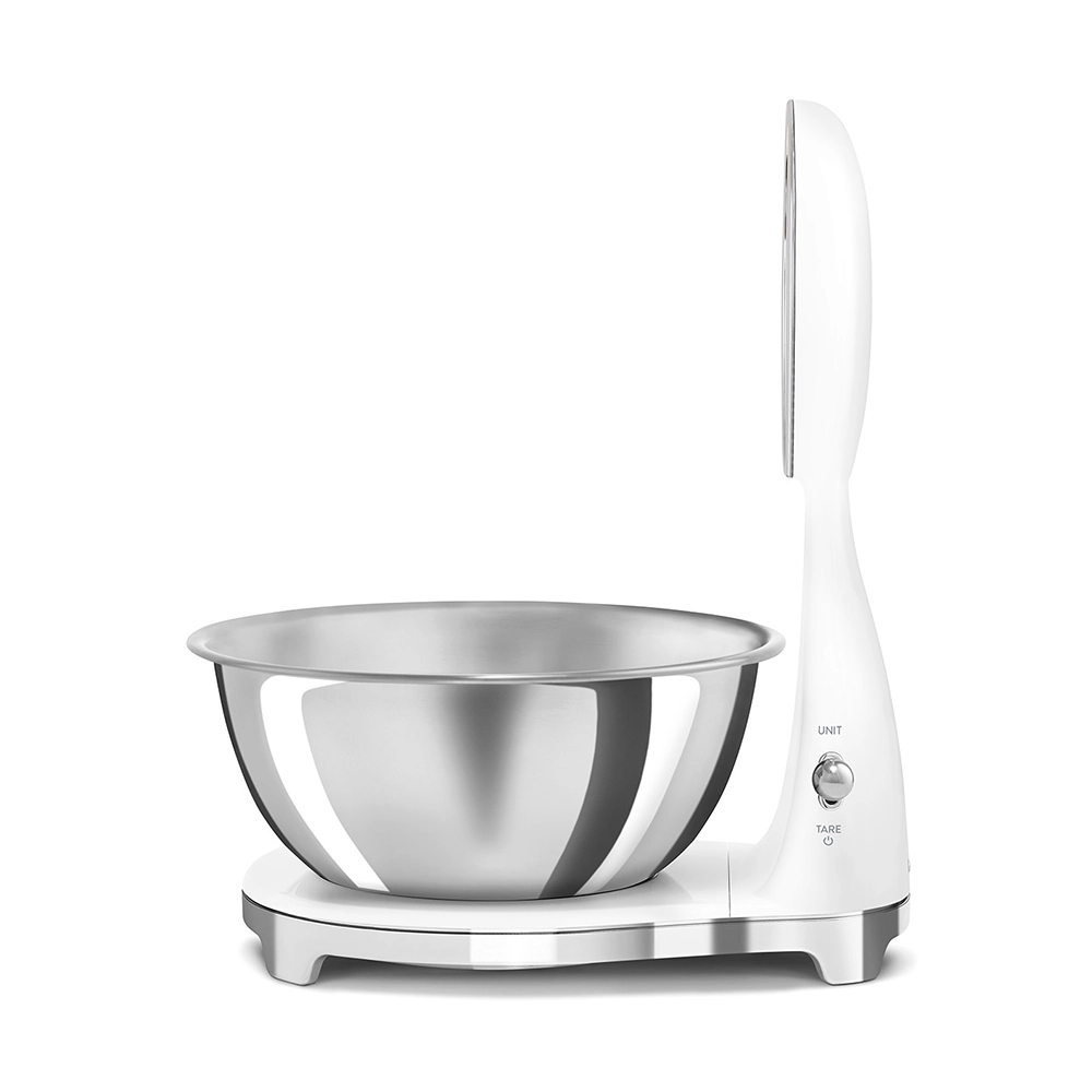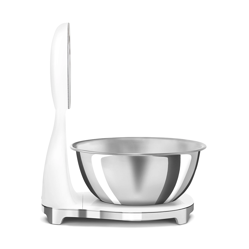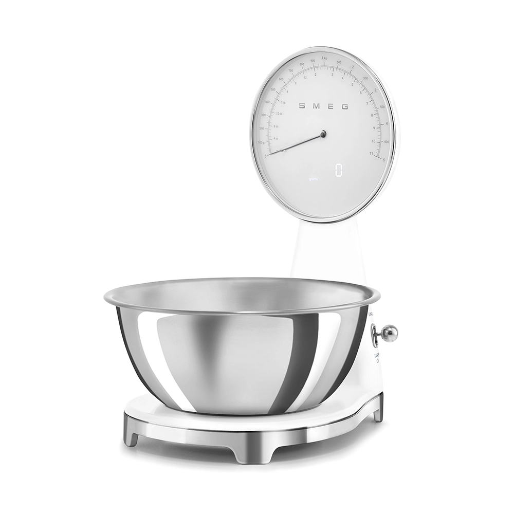 De analoge en digitale Smeg keukenweegschaal in stijlvolle witte kleur combineert het iconische jaren 50 design met moderne functionaliteit. Perfect voor iedereen die nauwkeurig wil afwegen zonder concessies te doen aan uitstraling en gebruiksgemak. Deze design keukenweegschaal is een praktische én stijlvolle toevoeging aan iedere keuken.