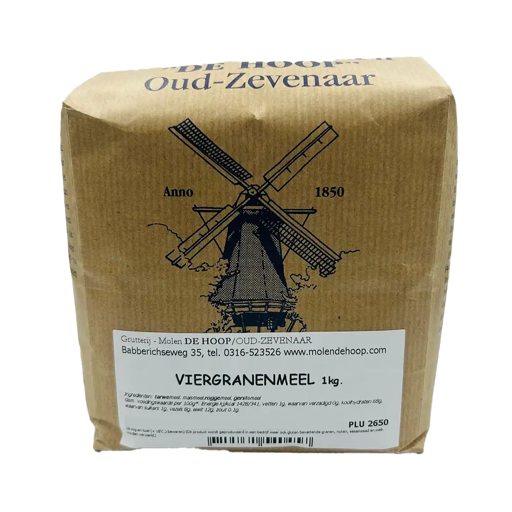 Viergranenmeel bestaat uit vier verschillende granen, tarwe, rogge, gerst en maïs. Dit tarwemeel is bereid zonder toevoegingen.