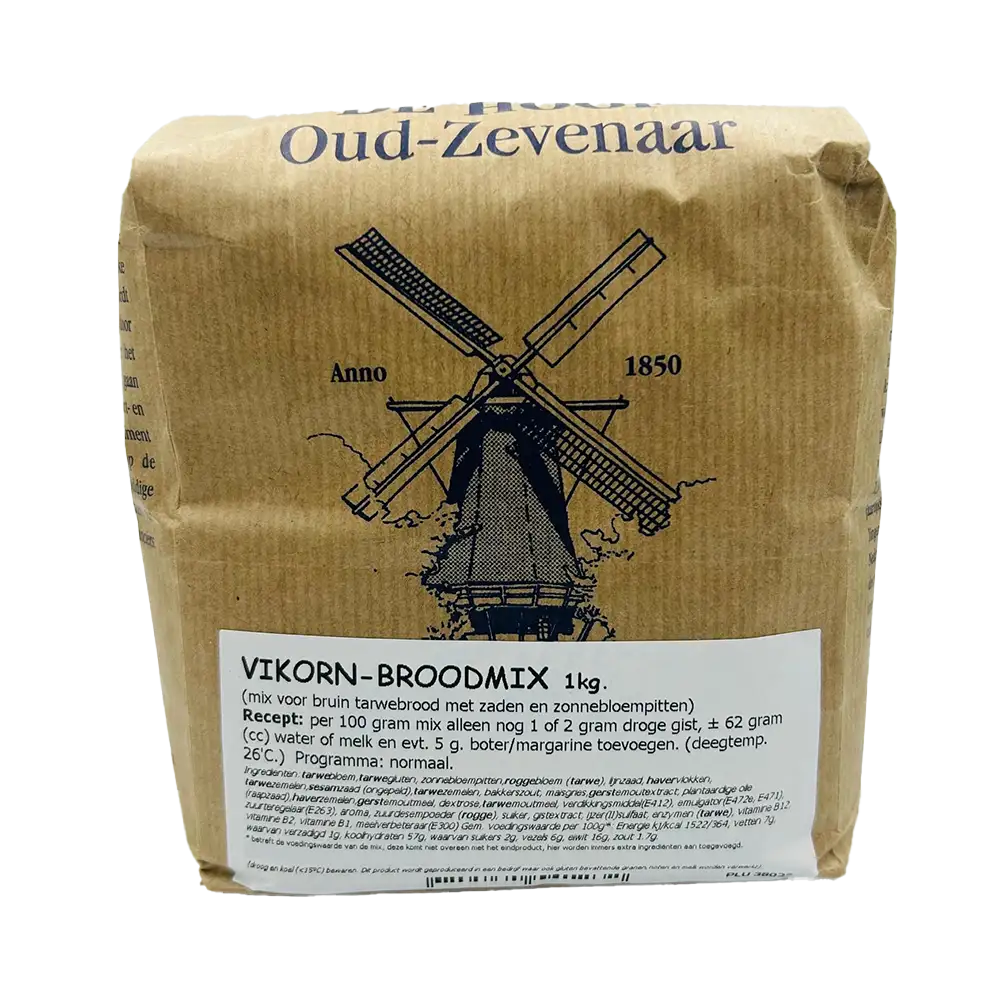 Broodmix voor een heerlijk bruin tarwebrood met zaden en zonnebloempitten. Aan deze Vikorn broodmix van Molen de Hoop hoef je enkel gist en water toe te voegen. Eetsmakelijk.